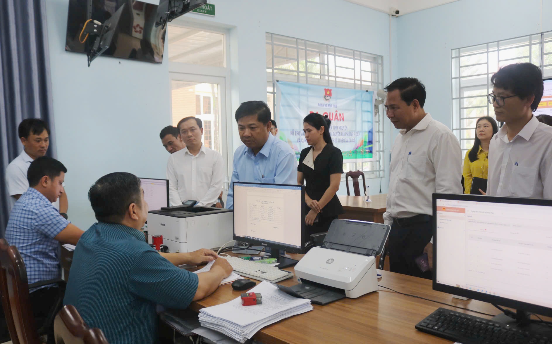 Bí thư Tỉnh ủy Lương Nguyễn Minh Triết hỏi thăm cán bộ về tình hình tiếp nhận thủ tục hành chính tại Trung tâm Phục vụ hành chính công xã Hòa Phú.