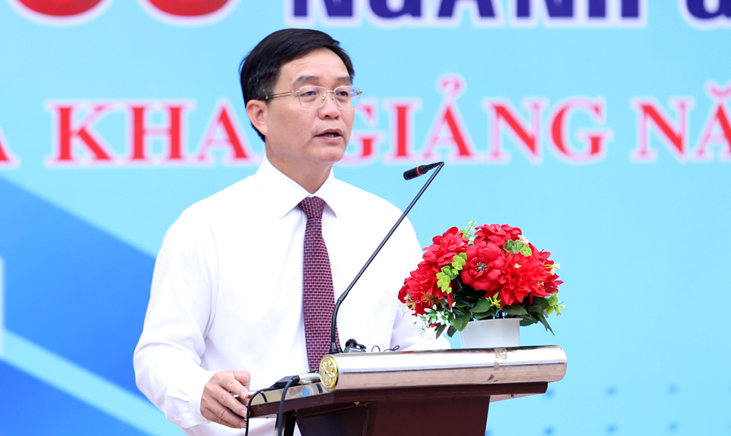 Đồng chí Nguyễn Đình Trung - Ủy viên Ban Chấp hành Trung ương Đảng, Bí thư Tỉnh ủy phát biểu tại Lễ khai giảng…