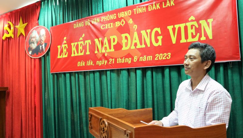 Phát biểu tại lễ kết nạp, đồng chí Võ Viết Minh Huy, Ủy viên Ban Thường vụ Đảng ủy đã chúc mừng Chi bộ 4 và cá nhân đồng chí Võ Thị Lý khi được đứng vào hàng ngũ của Đảng. Đây vừa là vinh dự, vừa là trách nhiệm của mỗi đảng viên. Đồng thời tin tưởng, đồng chí Lý sẽ tiếp tục giữ gìn phẩm chất đạo đức, nhiệt tình trong công tác, phát huy năng lực để cùng Chi bộ hoàn thành tốt nhiệm vụ, góp phần xây dựng Đảng bộ Văn phòng UBND tỉnh ngày càng phát triển.