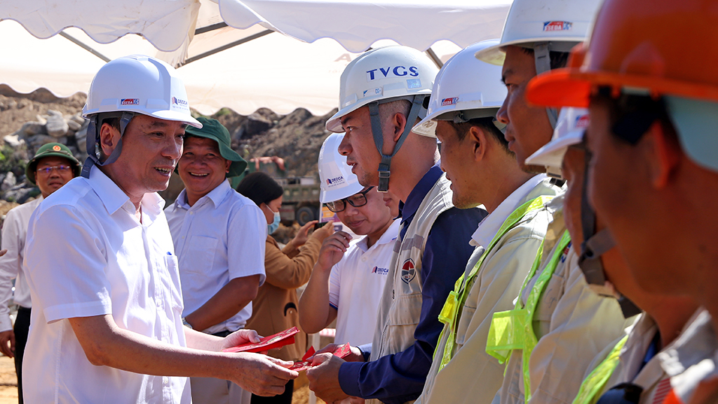 | Đồng chí Phạm Ngọc Nghị - Phó Bí thư Tỉnh ủy, Chủ tịch UBND tỉnh “lì xì” và động viên đội ngũ kỹ sư, công nhân thi công gói thầu số 1 thuộc Dự án thành phần 2 |
