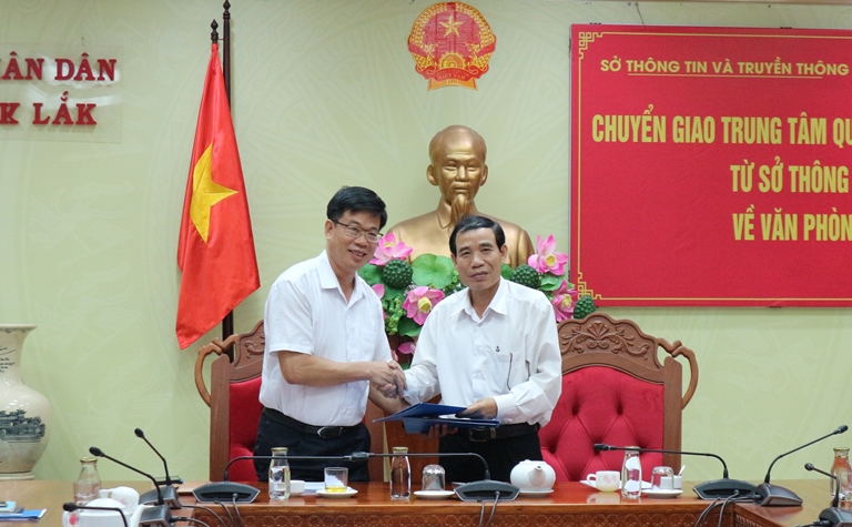 | Chánh Văn phòng UBND tỉnh Bùi Hồng Quý và Phó Giám đốc Sở Thông tin và Truyền thông Nguyễn Ngọc Tý trao đổi biên bản chuyển giao |