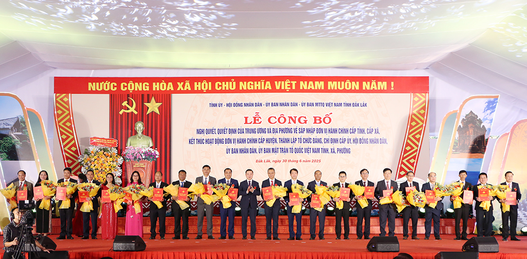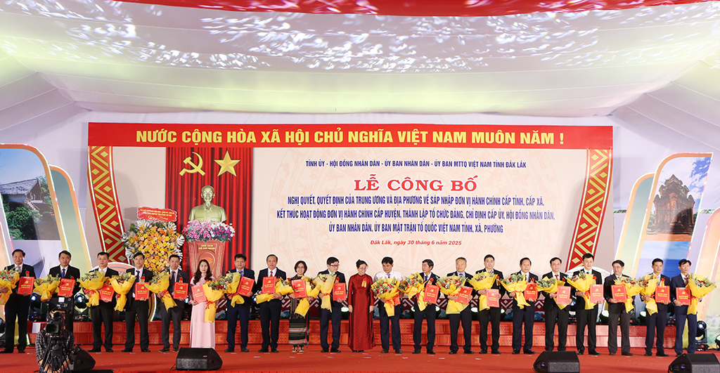 Sáng 30/6, tại Quảng trường 10/3, Tỉnh ủy, HĐND, UBND, Ủy ban MTTQ Việt Nam hai tỉnh Đắk Lắk và Phú Yên long trọng tổ chức Lễ công bố các nghị quyết, quyết định của Trung ương và địa phương về sáp nhập đơn vị hành chính cấp tỉnh, cấp xã, kết thúc hoạt động đơn vị hành chính cấp huyện, thành lập tổ chức đảng, chỉ định cấp uỷ, HĐND, UBND, Ủy ban MTTQ Việt Nam tỉnh, xã, phường.