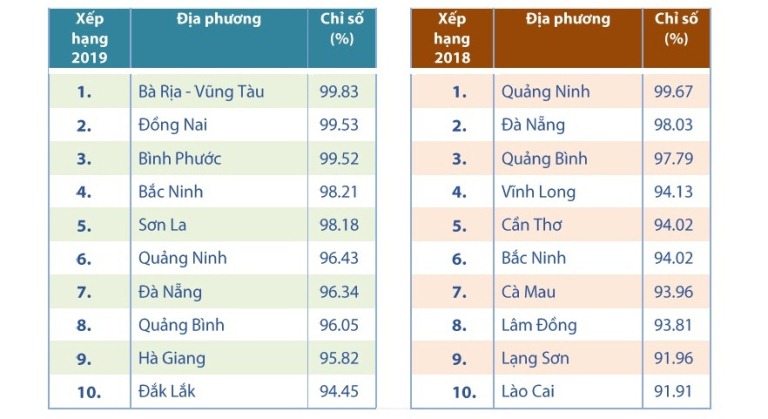 | So sánh nhóm 10 địa phương dẫn đầu Chỉ số thành phần "Cải cách TTHC" năm 2019 và năm 2018 |