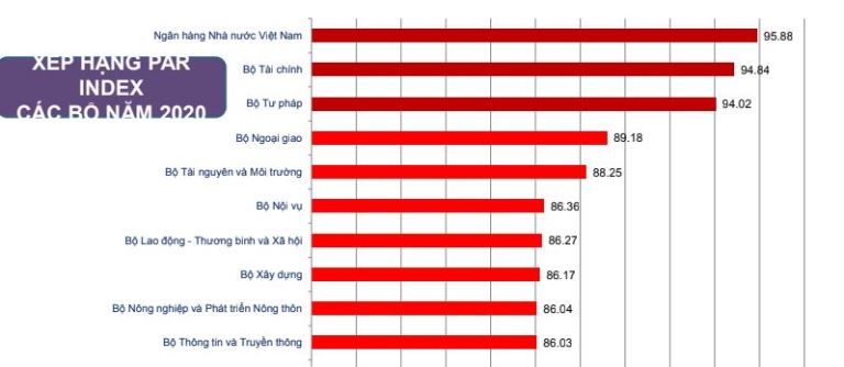 Theo kết quả công bố, năm 2020, Chỉ số CCHC năm 2020 các bộ tập trung vào 2 nhóm điểm. Nhóm thứ nhất, đạt kết quả Chỉ số CCHC trên 90%, tiếp tục là 3 đơn vị: Ngân hàng Nhà nước Việt Nam; Bộ Tài chính; Bộ Tư pháp. Nhóm thứ hai, đạt kết quả Chỉ số CCHC từ trên 80% đến dưới 90% gồm 14 đơn vị: Bộ Ngoại giao; Bộ Tài nguyên và Môi trường; Bộ Nội vụ; Bộ Lao động Thương binh và Xã hội; Bộ Xây dựng; Bộ Nông nghiệp và Phát triển nông thôn; Bộ Thông tin và Truyền thông; Bộ Giao thông Vận tải; Bộ Kế hoạch và Đầu tư; Bộ Công thương; Bộ Văn hóa, Thể thao và Du lịch; Bộ Khoa học và Công nghệ; Bộ Y tế; Bộ Giáo dục và Đào tạo. Không có đơn vị nào Chỉ số CCHC dưới 80%. Giá trị trung bình Chỉ số CCHC của 17 bộ, cơ quan ngang bộ đạt được là 87.56%, tăng 1.93% so với năm 2019 (chỉ đạt 85.63%), đồng thời tăng 12.18% so với năm 2012, năm đầu tiên sử dụng công cụ Chỉ số để đánh giá CCHC của các bộ, các tỉnh (chỉ đạt 75.38%). Chỉ số CCHC năm 2020 đạt giá trị trung bình cao nhất trong 9 năm triển khai xác định Chỉ số CCHC.