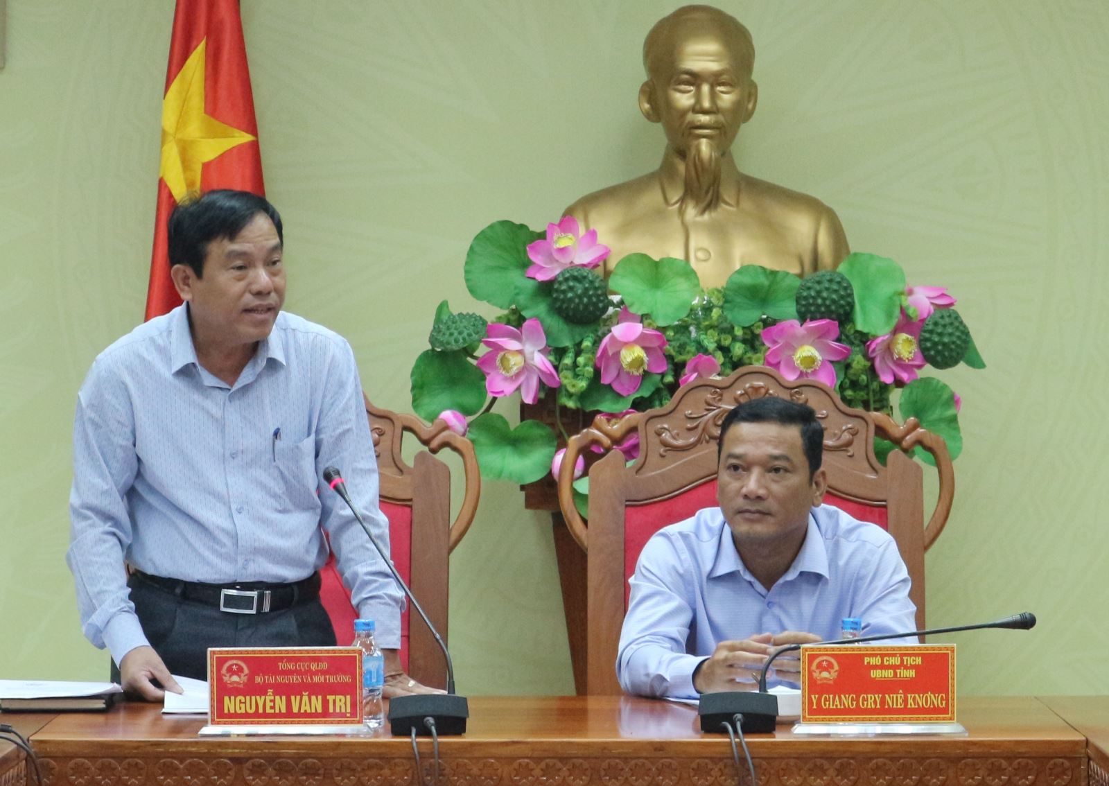 Sáng 29/10, Đoàn Thanh tra của Tổng Cục Quản lý đất đai, Bộ Tài Nguyên và Môi trường do đồng chí Nguyễn Văn Trị, Phó Cục trưởng Cục Kiểm soát quản lý và sử dụng đất đai Bộ Tài nguyên và Môi trường làm Trưởng đoàn đã công bố quyết định thanh tra việc chấp hành pháp luật đất đai trong quản lý, sử dụng đất của một số Ban quản lý rừng, công ty nông, lâm nghiệp trên địa bàn tỉnh Đắk Lắk. Tiếp và làm việc với đoàn có Phó Chủ tịch UBND tỉnh, Y Giang Gry Niê Knơng và lãnh đạo các sở, ngành, địa phương, đơn vị có liên quan.