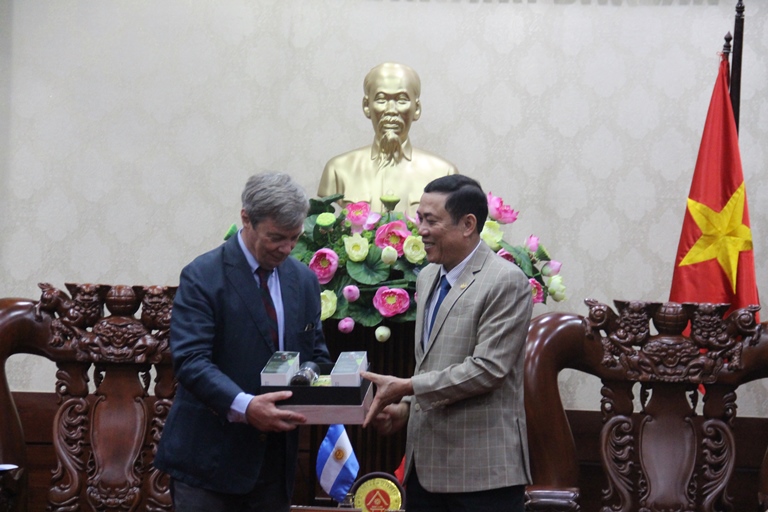 | Phó Chủ tịch UBND tỉnh Võ Văn Cảnh tặng quà cho Đại sứ Argentina tại Việt Nam Juan Carlos Valle Raleigh |