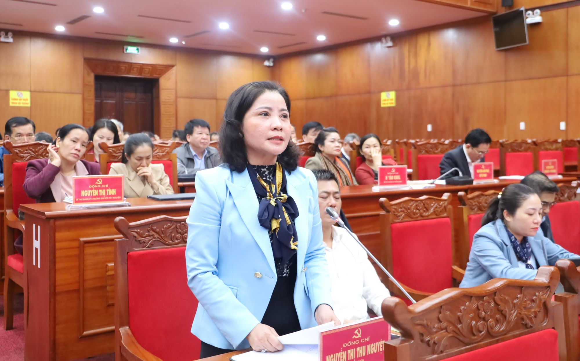 | Bí thư Thị ủy Buôn Hồ Nguyễn Thị Thu Nguyệt phát biểu thảo luận tại hội nghị. |