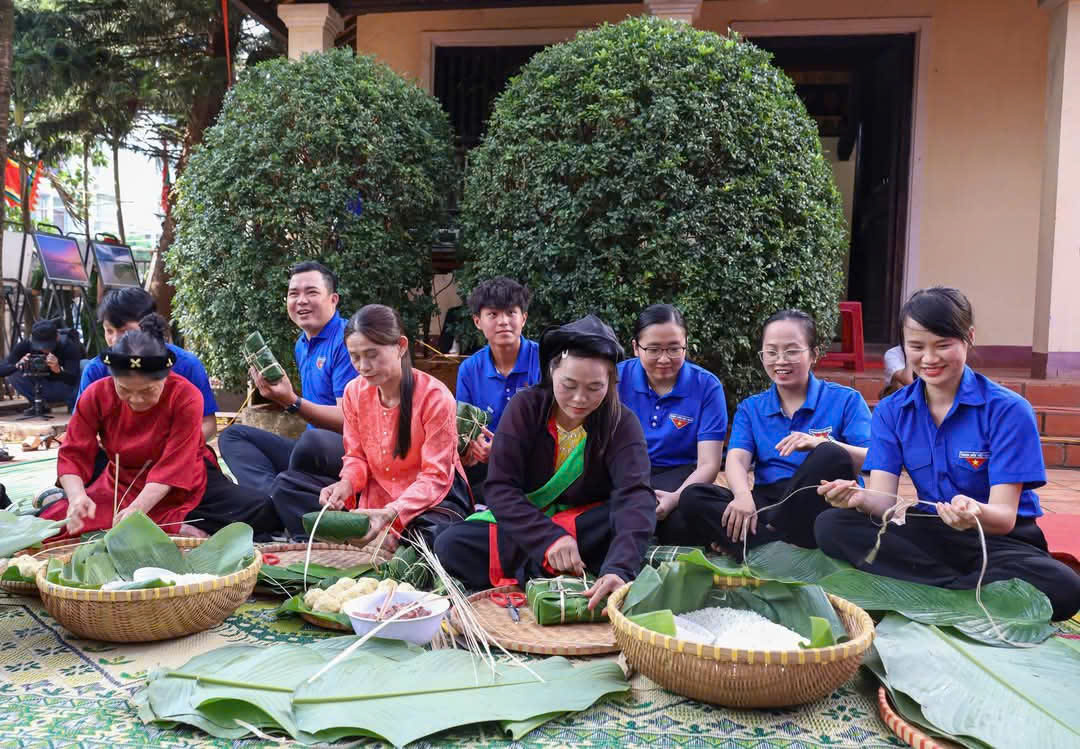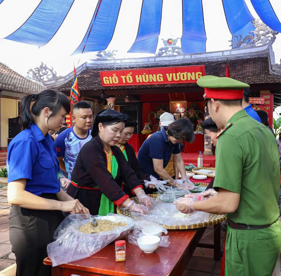 | Đông đảo đoàn viên, người dân tham gia trình diễn gói bánh chưng, bánh giày dâng lên các Vua Hùng |