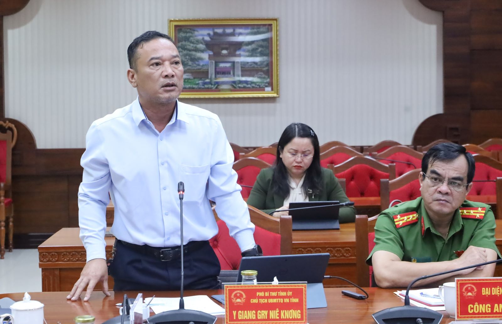 Phó Bí thư Tỉnh ủy, Chủ tịch Ủy ban MTTQ Việt Nam tỉnh Y Giang Gry Niê Knơng phát biểu tại cuộc họp.