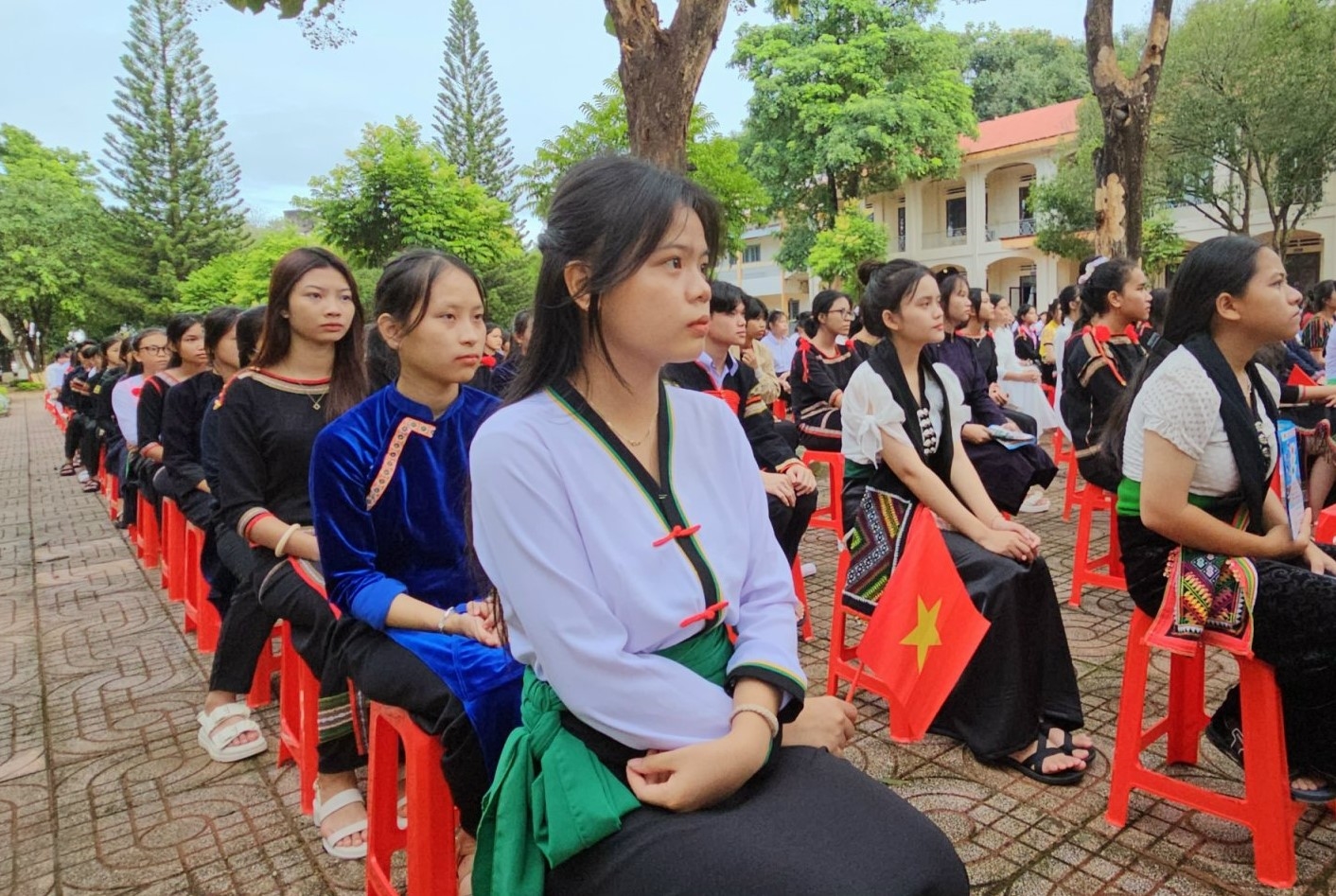 | Học sinh các dân tộc tại Trường THPT Dân tộc nội trú N'Trang Lơng, Đắk Lắk hân hoan chào đón năm học mới 2023 - 2024 (Ảnh: baodantoc.vn) |