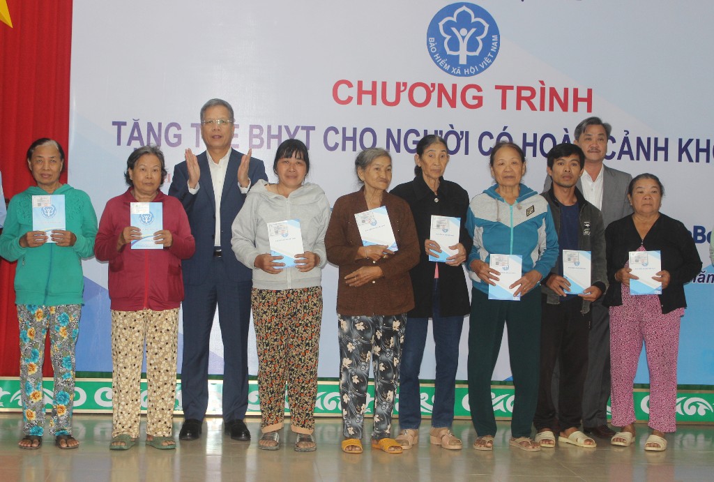 Phó Giám đốc Bảo hiểm xã hội Việt Nam Trần Đình Liệu và Phó Bí thư chuyên trách Đảng ủy UBND tỉnh Nguyễn Hữu Từ trao thẻ bảo hiểm y tế cho người dân xã Phú Hòa 2 (Hình minh họa: Nguồn daklak.gov.vn).