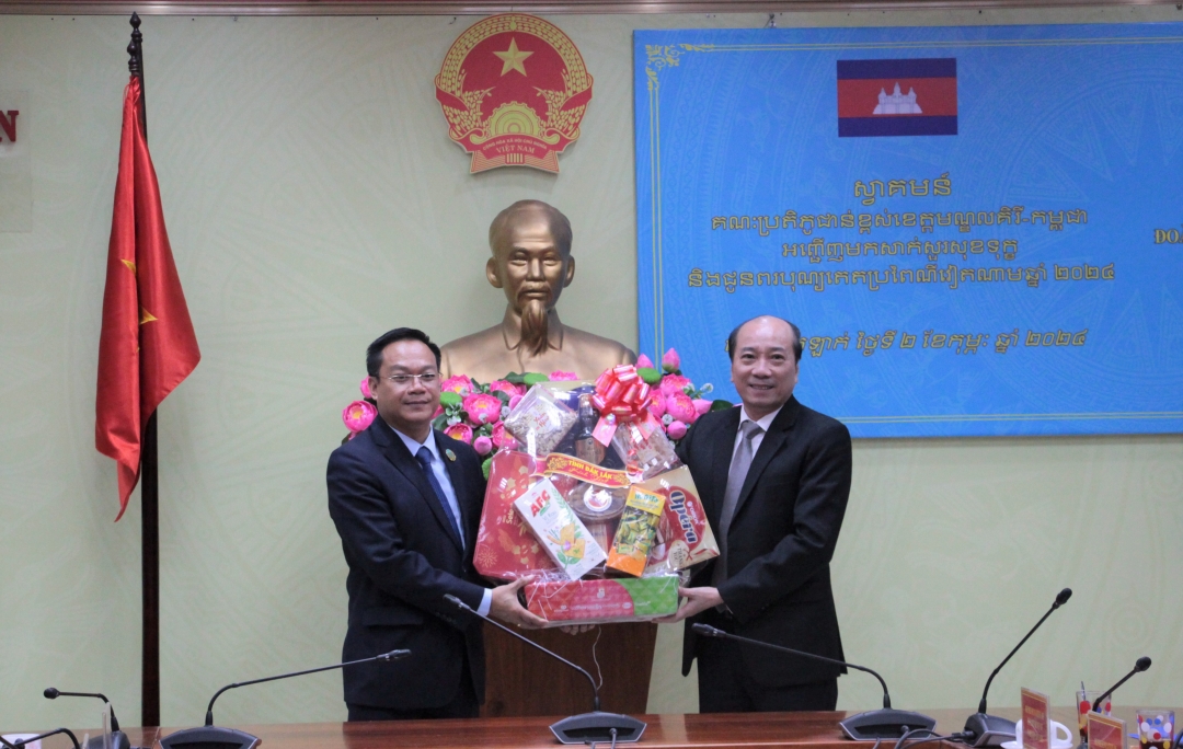 | Ngài Thang Savun (bìa trái), Tỉnh trưởng tỉnh Mondulkiri chúc mừng lãnh đạo tỉnh Đắk Lắk nhân dịp Tết Nguyên đán Giáp Thìn 2024 |