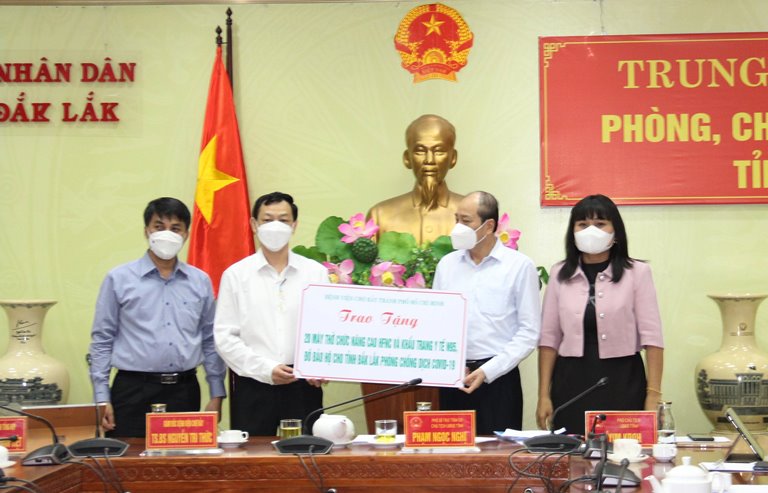 Cũng tại buổi làm việc, Đoàn Công tác của Bệnh viện Chợ Rẫy đã trao tặng tỉnh 20 máy thở chức năng cao HFNC, khẩu trang y tế N95 và đồ bảo hộ phòng chống dịch COVID-19.