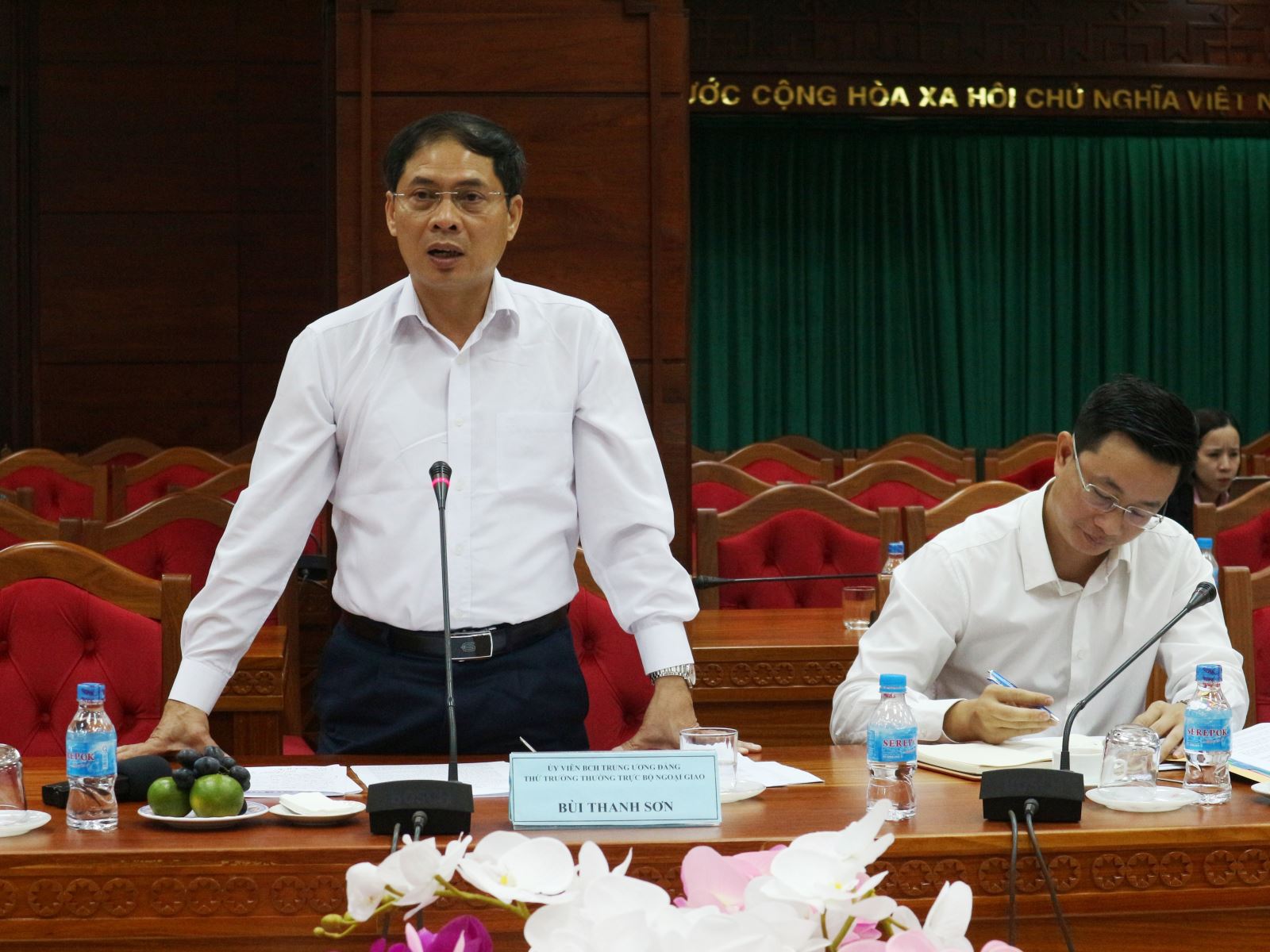 Phát biểu kết luận tại buổi làm việc, Ủy viên Trung ương Đảng, Thứ trưởng thường trực Bộ Ngoại giao - Bùi Thanh Sơn ghi nhận những kết quả trong công tác ngoại giao của tỉnh Đắk Lắk thời gian qua nhất là công tác đối thoại. Đồng chí hi vọng, tỉnh sẽ tiếp tục phát huy những kết quả đã đạt được, khắc phục những hạn chế còn tồn tại để công tác này đạt hiệu quả cao hơn trong thời gian tới, trong đó, xác định đối tác trọng tâm vào các lĩnh vực mà tỉnh cần đầu tư như Nhật Bản, Hàn Quốc, Úc; tiến hành xúc tiến ngoại giao kinh tế để xây dựng hình ảnh, phát triển Lễ hội Cà phê, Lễ hội Cồng chiêng Tây Nguyên; khi tỉnh có kế hoạch thực hiện công tác ngoại giao về xúc tiến đầu tư, thương mại thì cần thông tin ngay đến Bộ Ngoại giao để được hướng dẫn, giúp đỡ; tăng cường kêu gọi hỗ trợ viện trợ phi Chính phủ nước ngoài; định hướng dư luận về công tác thông tin báo chí và người Việt Nam ở nước ngoài…