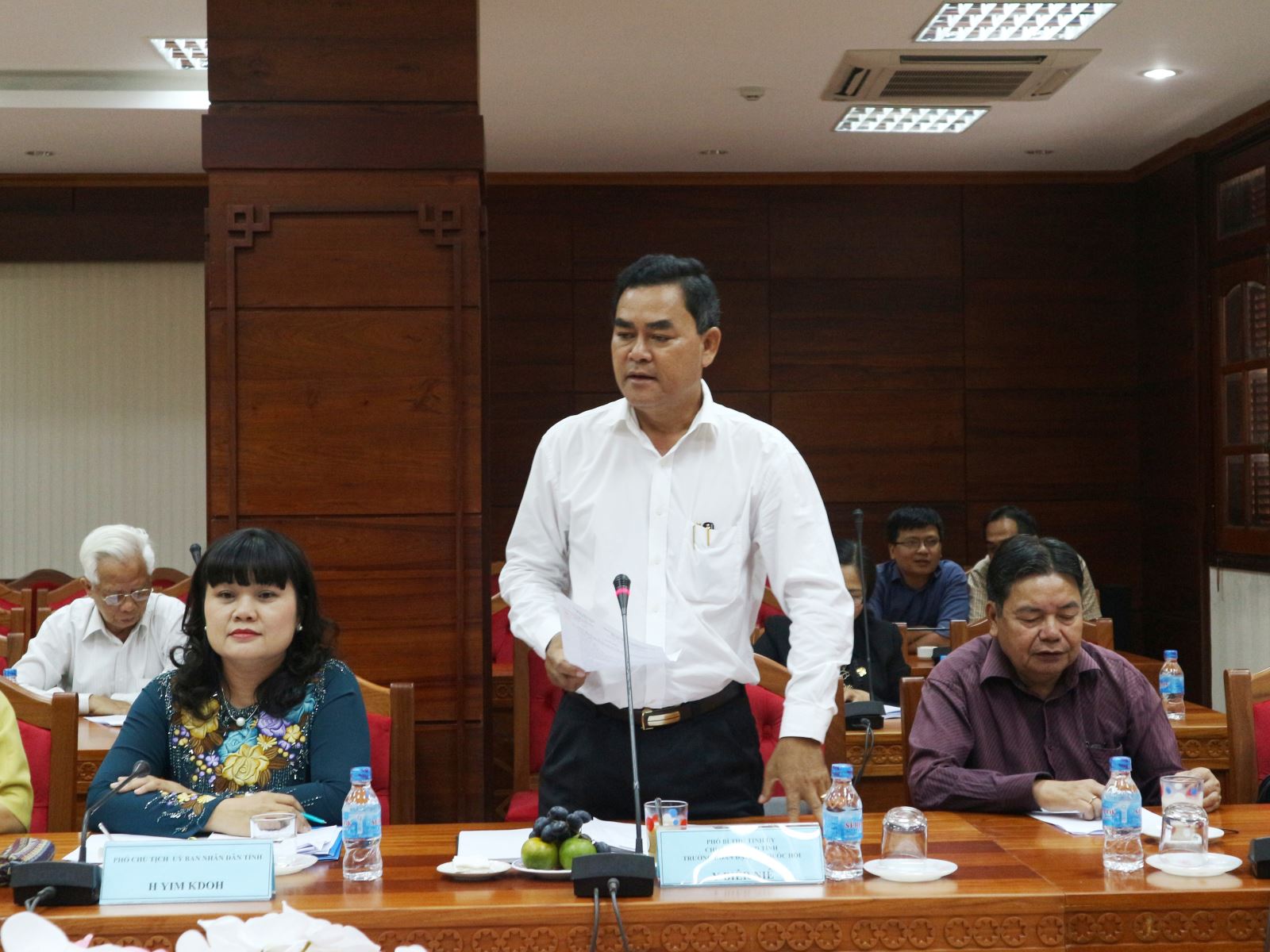 | Phó Bí thư Tỉnh ủy, Chủ tịch HDND tỉnh, Trưởng đoàn Đại biểu Quốc hội - Y Biêr tham gia ý kiến tại buổi làm việc |