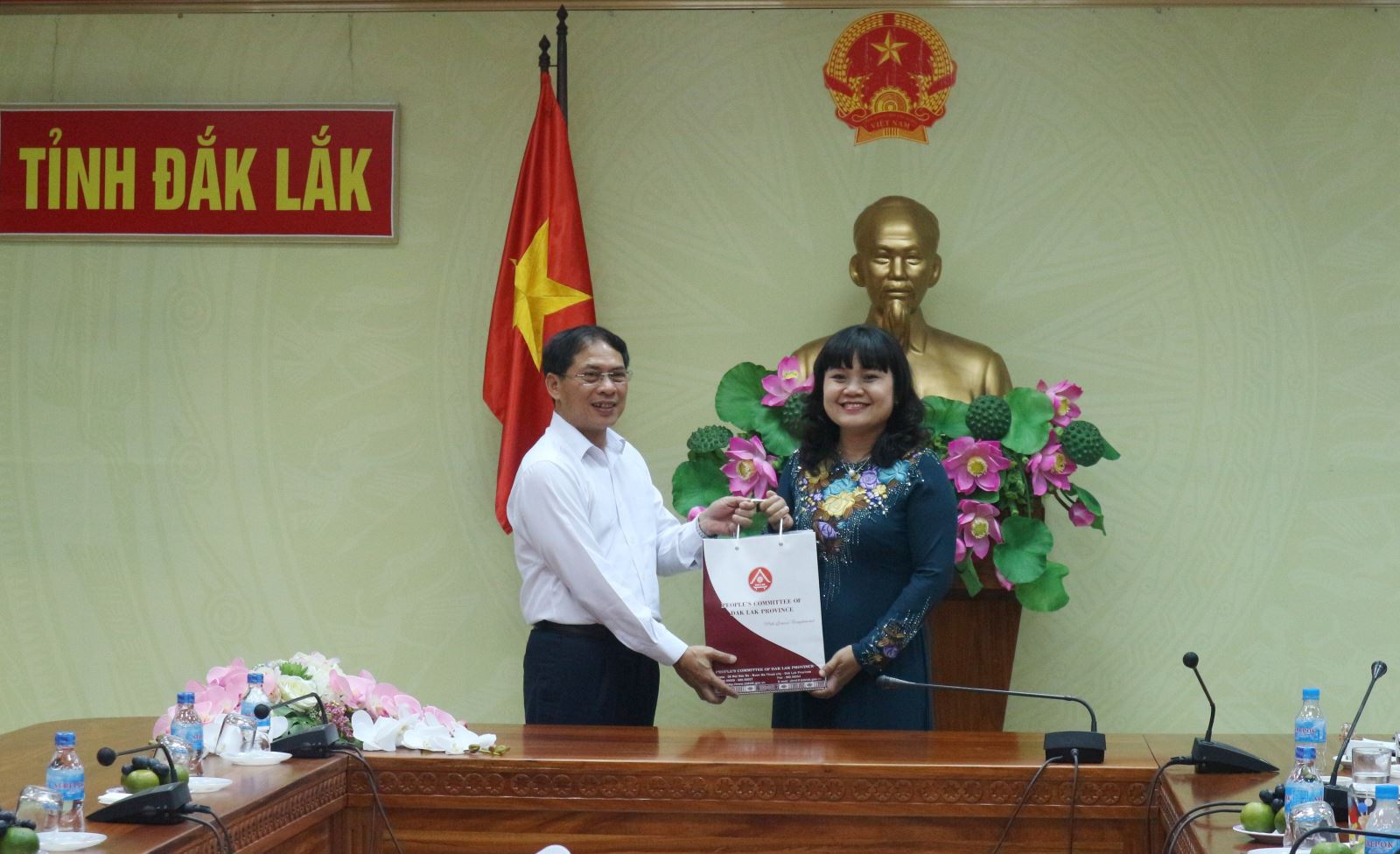 | Đồng chí H' Yim Kdoh - Phó Chủ tịch UBND tỉnh tặng quà lưu niệm cho Đoàn công tác của Bộ Ngoại giao |