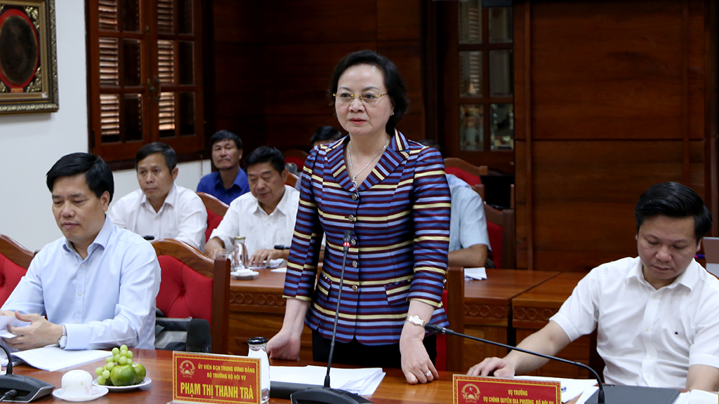 | Đồng chí Phạm Thị Thanh Trà - Ủy viên Trung ương Đảng, Bộ trưởng Bộ Nội vụ phát biểu kết luận buổi làm việc |
