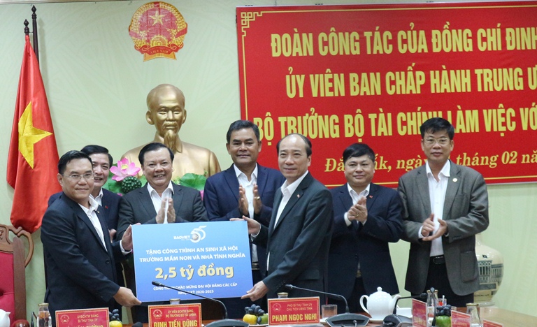 Nhân dịp này, Tập đoàn Bảo Việt thuộc Bộ Tài chính đã trao tặng tỉnh Đắk Lắk công trình an sinh xã hội trị giá 2,5 tỷ đồng gồm 01 trường mầm non và 10 căn nhà tình nghĩa, mỗi căn nhà trị giá 50 triệu đồng.