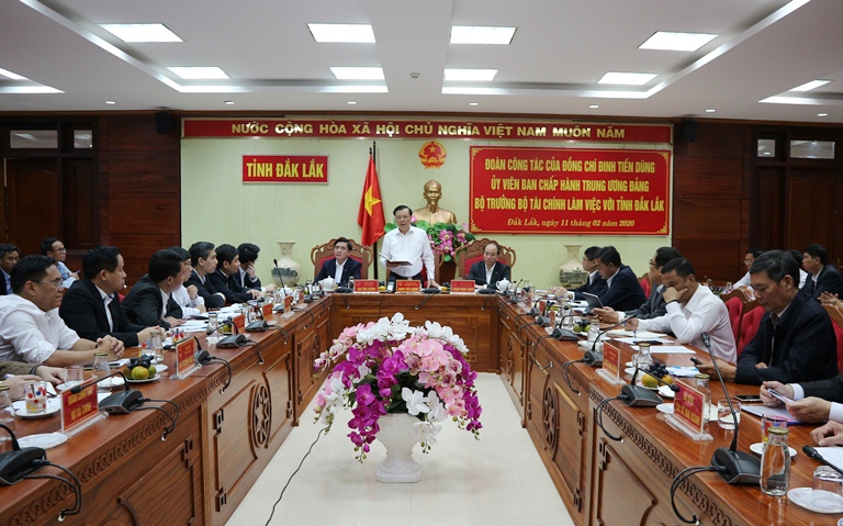 Phát biểu kết luận buổi làm việc, Ủy viên Trung ương Đảng, Bộ trưởng Bộ Tài chính Đinh Tiến Dũng đề nghị tỉnh Đắk Lắk tiếp tục tăng cường lãnh đạo, chỉ đạo triển khai hiệu quả nhiệm vụ tài chính – ngân sách nhà nước năm 2020; tiếp tục tổ chức sắp xếp, kiện toàn theo hướng tinh giản bộ máy các cơ quan thuế, kho bạc trên địa bàn tỉnh; thực hiện tốt công tác quản lý tài sản công, đặc biệt trong vấn đề quản lý, sử dụng, sở hữu đất đai; tăng cường kiểm tra, kiểm soát giá cả hàng hóa và chống buôn lậu, gian lận thương mại và hàng giả trên địa bàn; đẩy mạnh xã hội hoá lĩnh vực y tế, giáo dục để chủ động nguồn ngân sách trong thời gian tới.