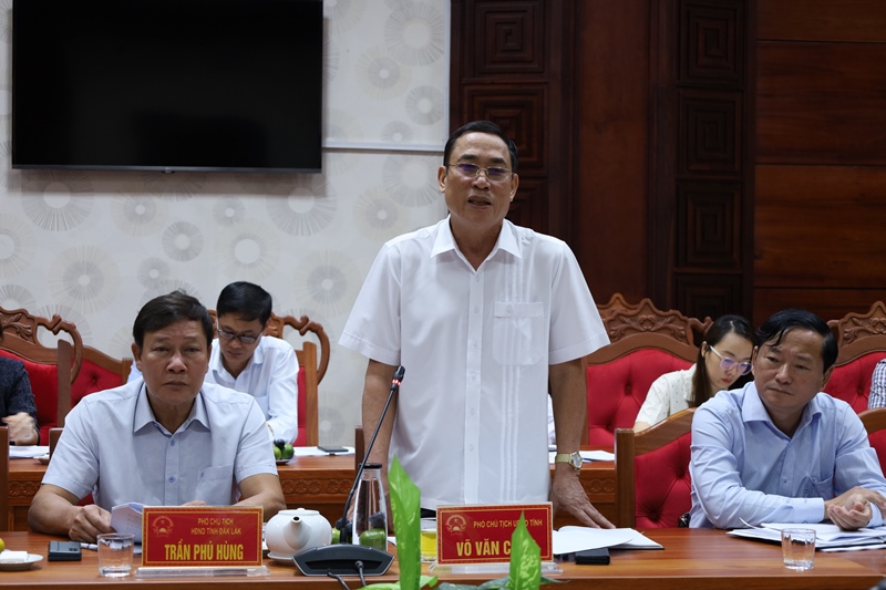| Phó Chủ tịch UBND tỉnh Đắk Lắk Võ Văn Cảnh báo cáo với Đoàn kiểm tra về tiến độ thực hiện xây dựng Đề án sắp xếp đơn vị hành chính tại tỉnh |