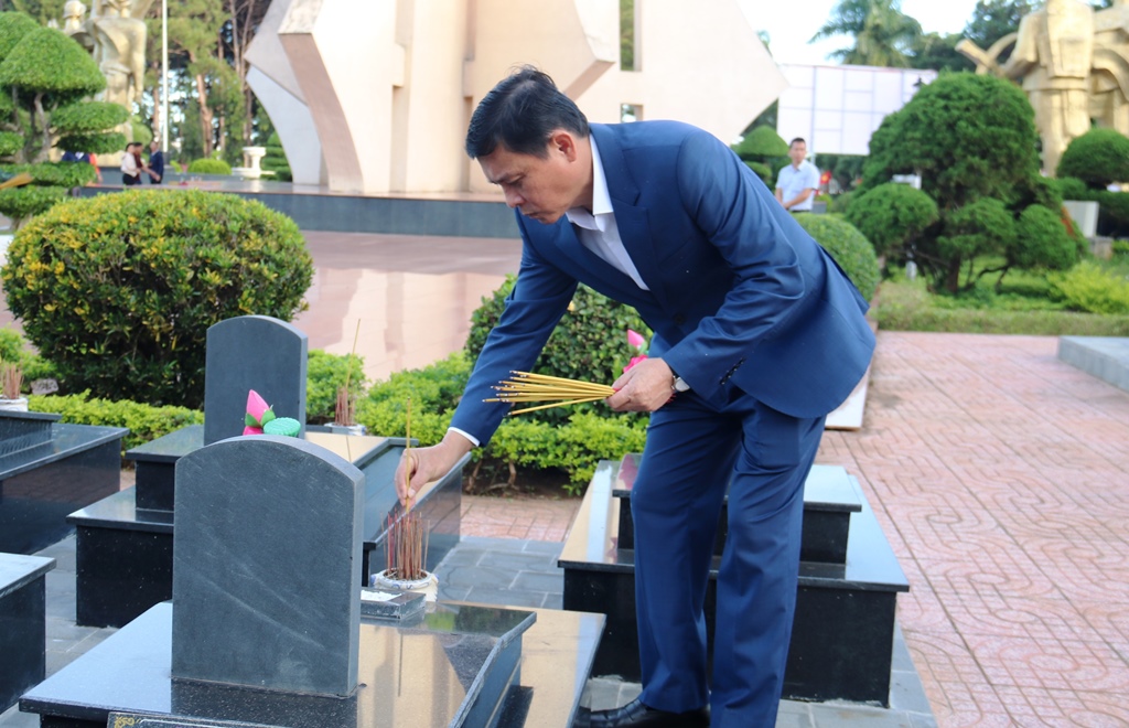 | Phó Chủ tịch Thường trực UBND tỉnh Nguyễn Tuấn Hà thắp hương lên phần mộ liệt sỹ |
