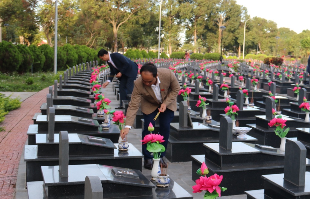 Trong không khí trang nghiêm của buổi lễ, các đại biểu đã thành kính đặt vòng hoa, dâng hương tri ân công ơn, sự hi sinh, cống hiến và dành một phút mặc niệm tưởng nhớ các anh hùng liệt sỹ đã anh dũng chiến đấu quên mình vì sự nghiệp giải phóng dân tộc, bảo vệ Tổ quốc Việt Nam xã hội chủ nghĩa và tinh thần quốc tế cao cả.