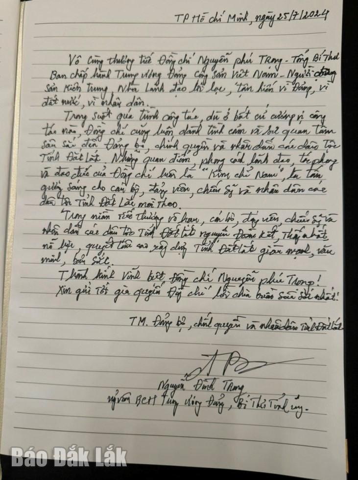 Sau khi kính cẩn dâng hoa, dâng hương, thay mặt Đảng bộ, chính quyền và nhân dân tỉnh Đắk Lắk, trong niềm tiếc thương vô hạn, đồng chí Bí thư Tỉnh ủy Nguyễn Đình Trung đã xúc động ghi vào Sổ tang tiễn biệt đồng chí Tổng Bí thư Nguyễn Phú Trọng