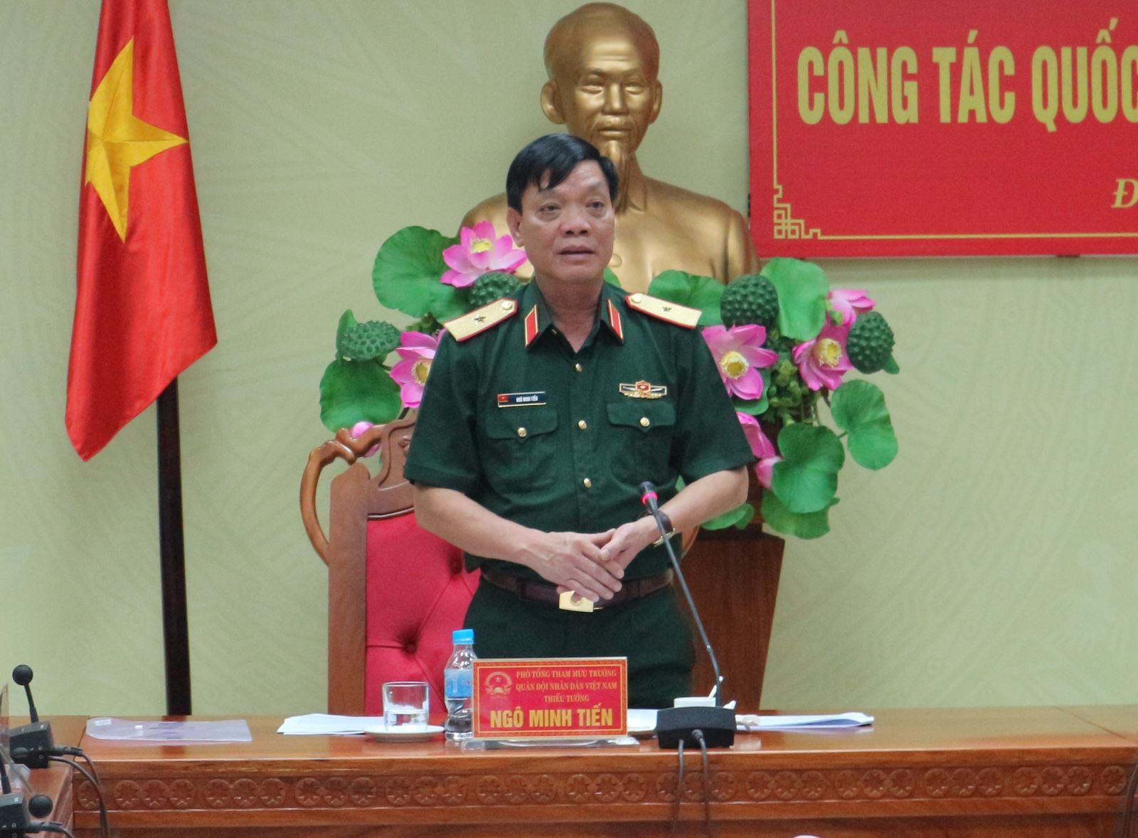 | Phó Tổng tham mưu trưởng Quân đội nhân dân Việt Nam, Thiếu tướng Nguyễn Minh Tiến phát biểu tại buổi làm việc |