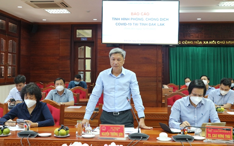 Phát biểu chỉ đạo tại buổi làm việc, PGS.TS Nguyễn Trường Sơn, Thứ trưởng Bộ Y tế nhấn mạnh: Đắk Lắk là một tỉnh chịu ảnh hưởng lớn của dịch, mặc dù số bệnh nhân không cao như các tỉnh phía Nam nhưng so sánh với số dân của tỉnh thì có tỷ lệ ca mắc cao. Thời gian tới, để công tác thu dung, điều trị bệnh nhân COVID-19 đạt hiệu quả cao, tỉnh cần nghiên cứu triển khai việc việc cách ly ở nhà đối với F1 có đủ điều kiện là đã được tiêm 1 mũi vắc-xin; điều trị F0 không có triệu chứng tại nhà nhưng phải phân theo cấp độ thành phố và nông thôn; tăng cường công tác cách ly và truy vết nhưng nếu trường hợp số ca mắc cao hơn 10.000 dân thì phải phong tỏa theo khu vực; thực hiện test nhanh theo tổ dân phố, thôn, buôn và tăng cường test nhanh xuống vùng sâu, vùng xa; đẩy nhanh tiến độ tiêm vắc-xin sau khi được phân bổ, tập trung ưu tiên đối tượng trên 50 tuổi, người bệnh nền, phụ nữ có thai; xét nghiệm PCR đảm bảo đáp ứng tiêu chí thời gian, tiến độ.