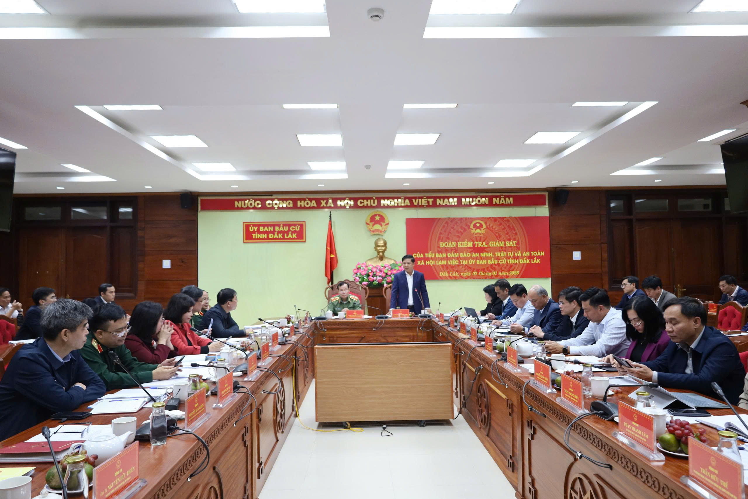 Chiều 7/1, Đoàn Kiểm tra, giám sát của Tiểu ban đảm bảo an ninh, trật tự và an toàn xã hội, Hội đồng bầu cử Quốc gia do Thượng tướng Lê Tấn Tới, Ủy viên Trung ương Đảng, Ủy viên Thường vụ Quốc hội, Chủ nhiệm Ủy ban Quốc phòng An ninh và Đối ngoại của Quốc hội, Phó Trưởng Tiểu ban Thường trực chủ trì đã làm việc tại Ủy Ban Bầu cử tỉnh Đắk Lắk nhằm rà soát, đánh giá kết quả triển khai công tác bầu cử và đảm bảo an ninh, trật tự, an toàn xã hội trên địa bàn tỉnh.