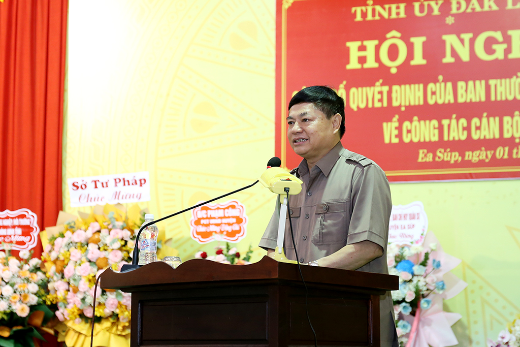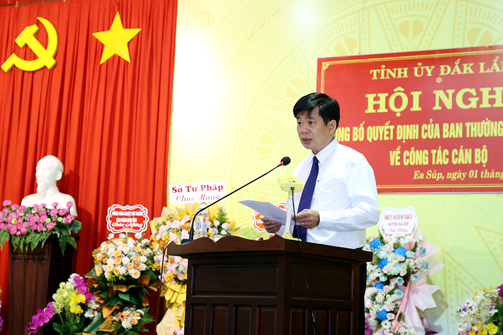 Sáng 01/8, tại Huyện ủy Ea Súp, Thường trực Tỉnh ủy tổ chức Hội nghị công bố Quyết định của Ban Thường vụ Tỉnh ủy về công tác cán bộ. Đồng chí Phạm Minh Tấn – Phó Bí thư Thường trực Tỉnh ủy chủ trì hội nghị. Dự Hội nghị có đồng chí Nguyễn Thiên Văn – Tỉnh ủy viên, Phó Chủ tịch UBND; đại diện lãnh đạo Ban Tổ chức Tỉnh ủy.