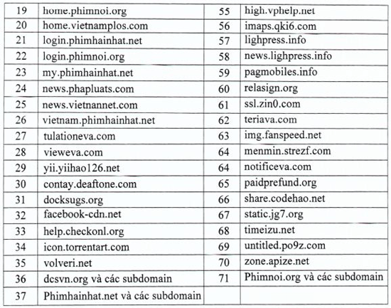 - Giám sát nghiêm ngặt, ngăn chặn kết nối đến các máy chủ điểu khiển mã độc APT, Theo đó, các thông tin về domain và IP máy chủ liên quan đến mã độc APT gồm có: 17 địa chỉ IP máy chủ điều khiển mã độc; 71 tên miền máy chủ độc hại và 20 mã băm HashMD5: