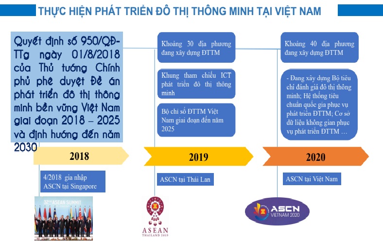 Thực hiện Quyết định số 950/QĐ-TTg, ngày 01/8/2018 của Chính phủ về việc phê duyệt Đề án phát triển đô thị thông minh bền vững Việt Nam giai đoạn 2018 - 2025 định hướng đến năm 2030, đến nay cả nước đã có khoảng 40 địa phương đang xây dựng đô thị thông minh và xây dựng bộ tiêu chí đánh giá đô thị thông minh. Mục tiêu đến năm 2030, cả nước sẽ hình thành các chuỗi đô thị thông minh khu vực phía Bắc, miền Trung, phía Nam và vùng Đồng bằng sông Cửu Long, lấy các thành phố Hà Nội, TP. Hồ Chí Minh, Đà Nẵng, Cần Thơ là hạt nhân hình thành mạng lưới liên kết các đô thị thông minh.