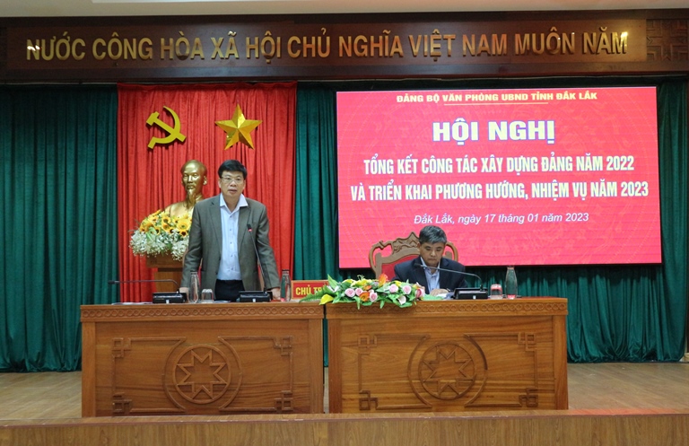 Phát biểu chỉ đạo hội nghị, Bí thư Đảng ủy, Chánh Văn phòng UBND tỉnh Bùi Hồng Quý ghi nhận sự nỗ lực, cố gắng của đảng viên và các chi bộ trong công tác đảng năm 2022. Năm 2023 - Năm “bản lề” thực hiện nhiệm vụ của cả nhiệm kỳ, do đó để hoàn thành tốt các nhiệm vụ đề ra đảm bảo đúng tiến độ và chất lượng, đồng chí yêu cầu toàn đảng viên trong Đảng bộ phát huy vai trò của mình trong việc thực hiện nhiệm vụ chính trị và công tác xây dựng đảng, qua đó, góp phần thực hiện thắng lợi các nhiệm vụ của Đảng ủy Khối các cơ quan và doanh nghiệp tỉnh, của Tỉnh uỷ nói chung và Đảng ủy Văn phòng nói riêng.