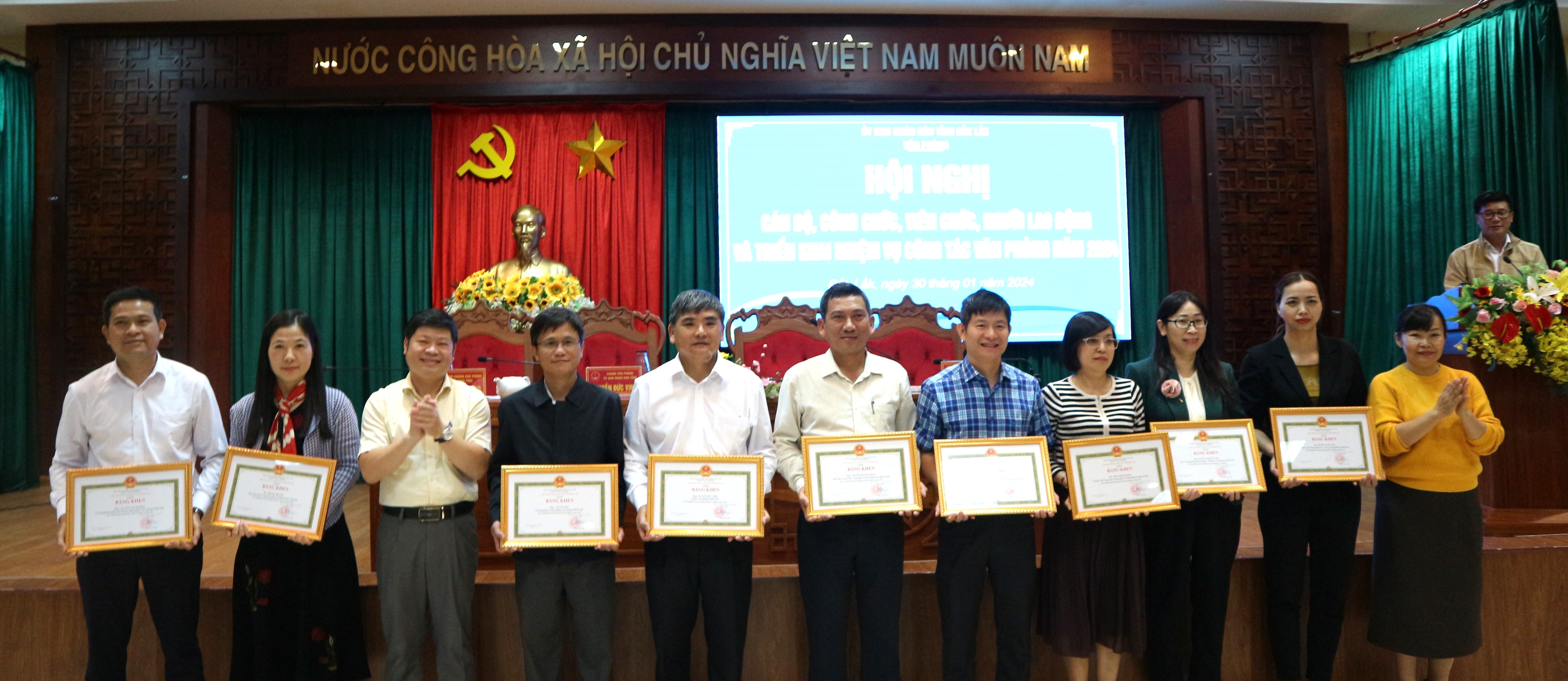 Hội nghị đã trao tặng Huân chương Lao động hạng Nhì của Chủ tịch nước cho 2 cá nhân và Bằng khen của Thủ tướng Chính phủ cho 1 cá nhân vì đã có thành tích xuất sắc trong công tác từ năm 2018 đến năm 2022 góp phần vào sự nghiệp xây dựng chủ nghĩa xã hội và bảo vệ Tổ quốc. UBND tỉnh tặng Danh hiệu Tập thể Lao động xuất sắc cho 12 tập thể; tặng Bằng khen cho 7 tập thể và 12 cá nhân đã có thành tích hoàn thành xuất sắc nhiệm vụ công tác năm 2023. Văn phòng UBND tỉnh tặng Danh hiệu Tập thể Lao động tiên tiến cho 12 phòng, đơn vị; tặng Danh hiệu Lao động tiên tiến cho 100 cá nhân; tặng Danh hiệu Chiến sĩ thi đua cơ sở cho 62 cá nhân và tặng Giấy khen cho 03 tập thể và 38 cá nhân vì có thành tích xuất sắc trong công tác năm 2023.