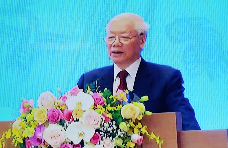 | Tổng Bí thư, Chủ tịch nước Nguyễn Phú Trọng phát biểu chỉ đạo tại hội nghị (Ảnh chụp từ màn hình) |