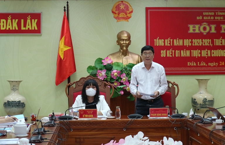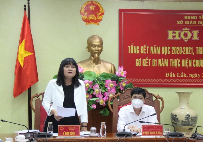 Phát biểu chỉ đạo tại hội nghị, Phó Chủ tịch UBND tỉnh H'Yim Kđoh ghi nhận, biểu dương những kết quả đã đạt được của ngành GDĐT trong năm học 2020 - 2021. Để hoàn thành các chỉ tiêu của năm học 2021 - 2022 (cuối năm 2021 đạt 53%, cuối năm 2022 đạt 54%; 100% thôn, buôn có trường, lớp mẫu giáo; 70% tỷ lệ phòng học kiên cố vào cuối năm 2021 và đạt 72% vào cuối năm 2022), Phó Chủ tịch UBND tỉnh đề nghị ngành GDĐT chủ động xây dựng và triển khai kế hoạch năm học 2021 - 2022 linh hoạt, phù hợp với tình hình dịch COVID-19 tại địa phương; tiếp tục triển khai Chương trình giáo dục phổ thông năm 2018 đảm bảo chất lượng và hiệu quả, đặc biệt đối với lớp 1, lớp 2, lớp 6; tiếp tục thực hiện quy hoạch, sắp xếp mạng lưới trường, lớp học, tăng cường cơ sở vật chất, thiết bị dạy học; đẩy mạnh ứng dụng công nghệ thông tin và chuyển đổi số trong GDĐT gắn với đổi mới công tác quản lý, đổi mới phương pháp dạy và học; đẩy mạnh hội nhập quốc tế trong giáo dục và đào tạo... Đặc biệt lưu ý xây dựng phương án phòng chống dịch COVID-19 để đảm bảo an toàn cho giáo viên và học sinh khi đi học trở lại trong thời gian tới.