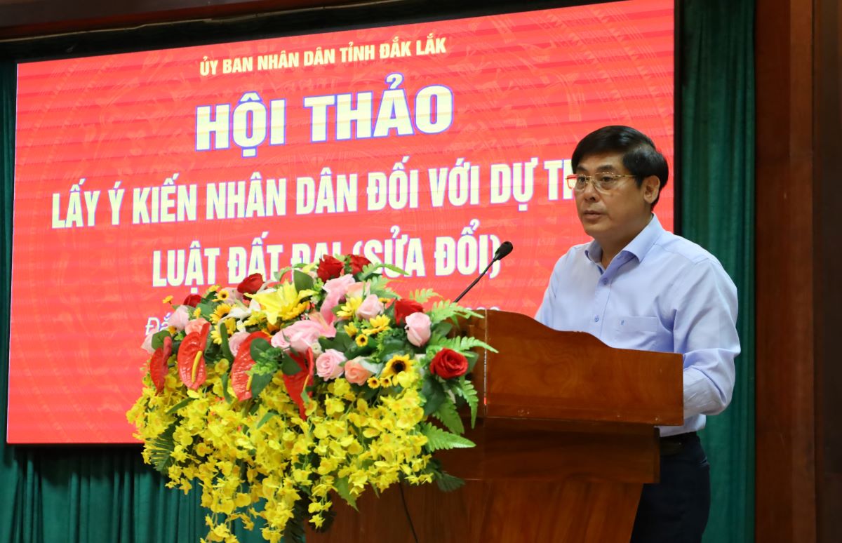 Sáng 8/3, UBND tỉnh tổ chức Hội thảo lấy ý kiến Nhân dân đối với dự thảo Luật Đất đai (sửa đổi). Tham dự hội thảo có các đồng chí: Y Biêr Niê - Phó Bí thư Tỉnh ủy; Trần Phú Hùng - Phó Chủ tịch HĐND tỉnh; Lê Thị Thanh Xuân - Phó Trưởng đoàn chuyên trách, phụ trách Đoàn ĐBQH tỉnh; đại diện lãnh đạo các sở, ban, ngành, đơn vị, địa phương trong tỉnh. Phó Chủ tịch UBND tỉnh Võ Văn Cảnh và Giám đốc Sở Tài nguyên và Môi trường Trần Đình Nhuận đồng chủ trì hội thảo.