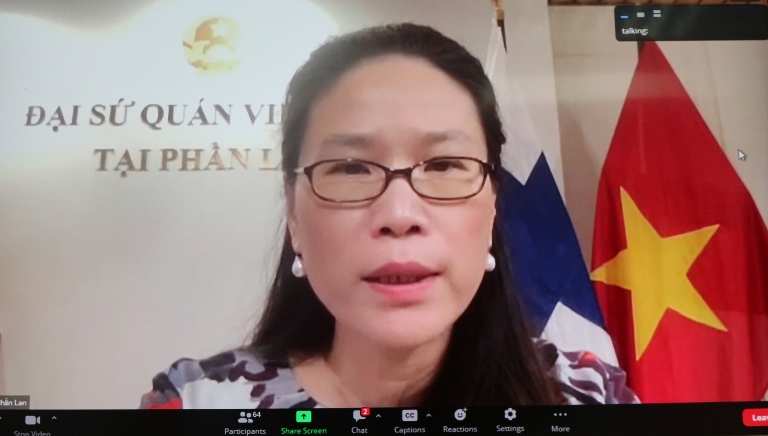 | Bà Đặng Thị Hải Tâm, Đại sứ Việt Nam tại Phần Lan phát biểu tại buổi hội thảo (Ảnh chụp từ màn hình) |