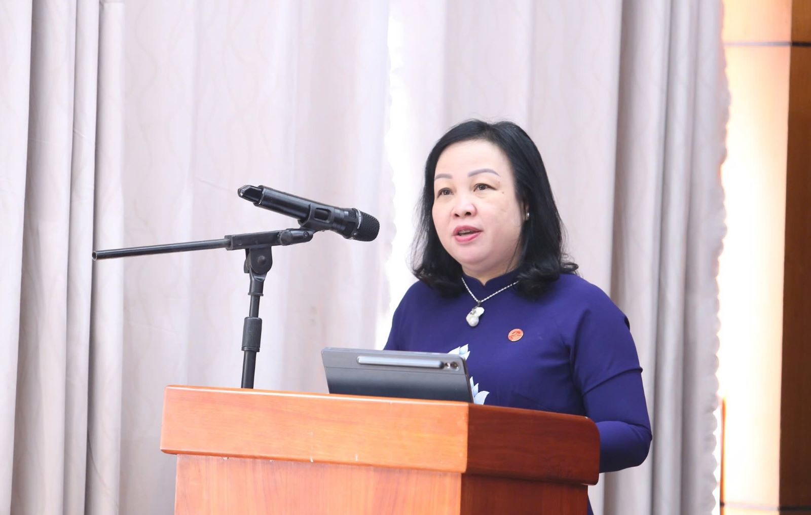 Đồng chí Đinh Thị Thu Thanh - Ủy viên Ban Thường vụ Tỉnh ủy, Trưởng Ban Tuyên giáo và Dân vận Tỉnh ủy phát biểu tại buổi họp báo.