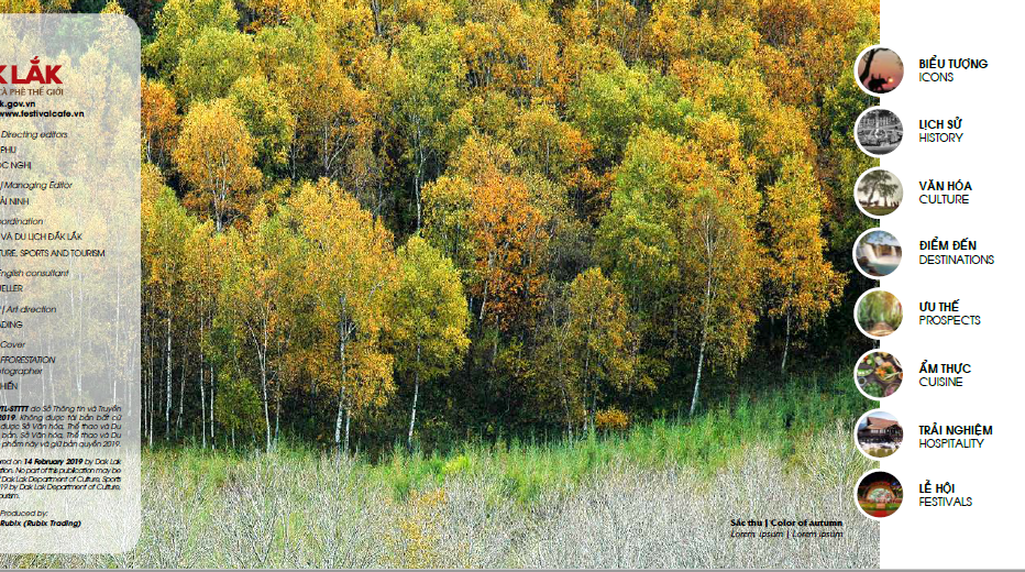 Ấn phẩm phục vụ Lễ hội Cà phê Buôn Ma Thuột lần thứ 7 năm 2019 với chủ đề “Đắk Lắk - Tinh hoa đại ngàn” do Công ty RUBIX Trading (Hà Nội) thực hiện nhằm giới thiệu và quảng bá hình ảnh về truyền thống, lịch sử, bản sắc văn hóa, tiềm năng, thế mạnh về phát triển kinh tế - xã hội của tỉnh Đắk Lắk đến với du khách đến từ trong và ngoài nước. Ấn phẩm sách ảnh gồm các phần: biểu tượng; lịch sử; văn hóa; điểm đến; ưu thế; ẩm thực; trải nghiệm; lễ hội.