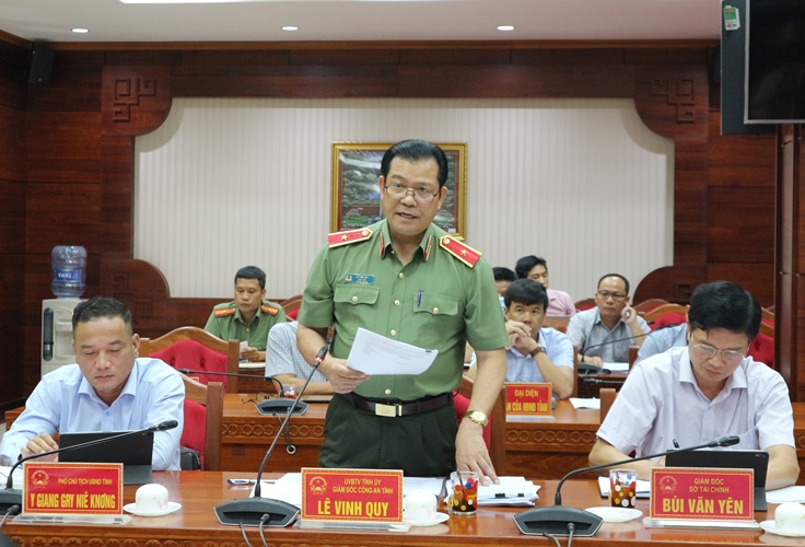| Ủy viên Ban Thường vụ Tỉnh ủy, Giám đốc Công an tỉnh Lê Vinh Quy trình bày dự thảo nghị quyết |