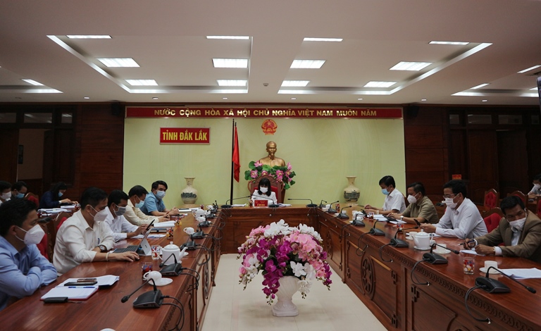 | Phó Chủ tịch UBND tỉnh H’Yim Kđoh chủ trì và lãnh đạo một số sở, ngành tham dự tại điểm cầu Đắk Lắk |