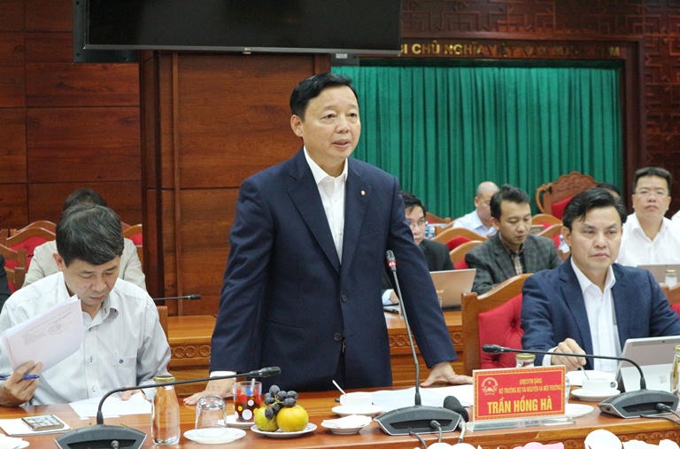 Phát biểu kết luận buổi làm việc, Uỷ viên Ban Chấp hành Trung ương Đảng, Bộ trưởng Bộ Tài nguyên và Môi trường Trần Hồng Hà ghi nhận những kết quả đã đạt được của tỉnh trong lĩnh vực tài nguyên và môi trường. Để phát triển nền kinh tế của tỉnh, đồng chí đề nghị tỉnh ưu tiên phát triển các tiềm năng sẵn có để chọn làm quy hoạch của tỉnh năm 2020; chuyển đổi quy mô kinh tế về nông nghiệp trên cơ sở phát triển bền vững; tập trung những khâu mang tính đột phá. Riêng công tác tài nguyên và môi trường cần tinh gọn bộ máy nhà nước trên cơ sở nâng cao chất lượng nguồn nhân lực; thực hiện đúng quy định của pháp luật về xác định tiêu chí ưu tiên để miễn đấu thầu mà chỉ định nhà đầu tư; ưu tiên công tác đo đạc đất đai; thu hút đầu tư từ nguồn tài nguyên khoáng sản của tỉnh; siết chặt quản lý nhà nước về chất thải đô thị; phát triển các dự án liên quan đến công trình giữ nước và môi trường.