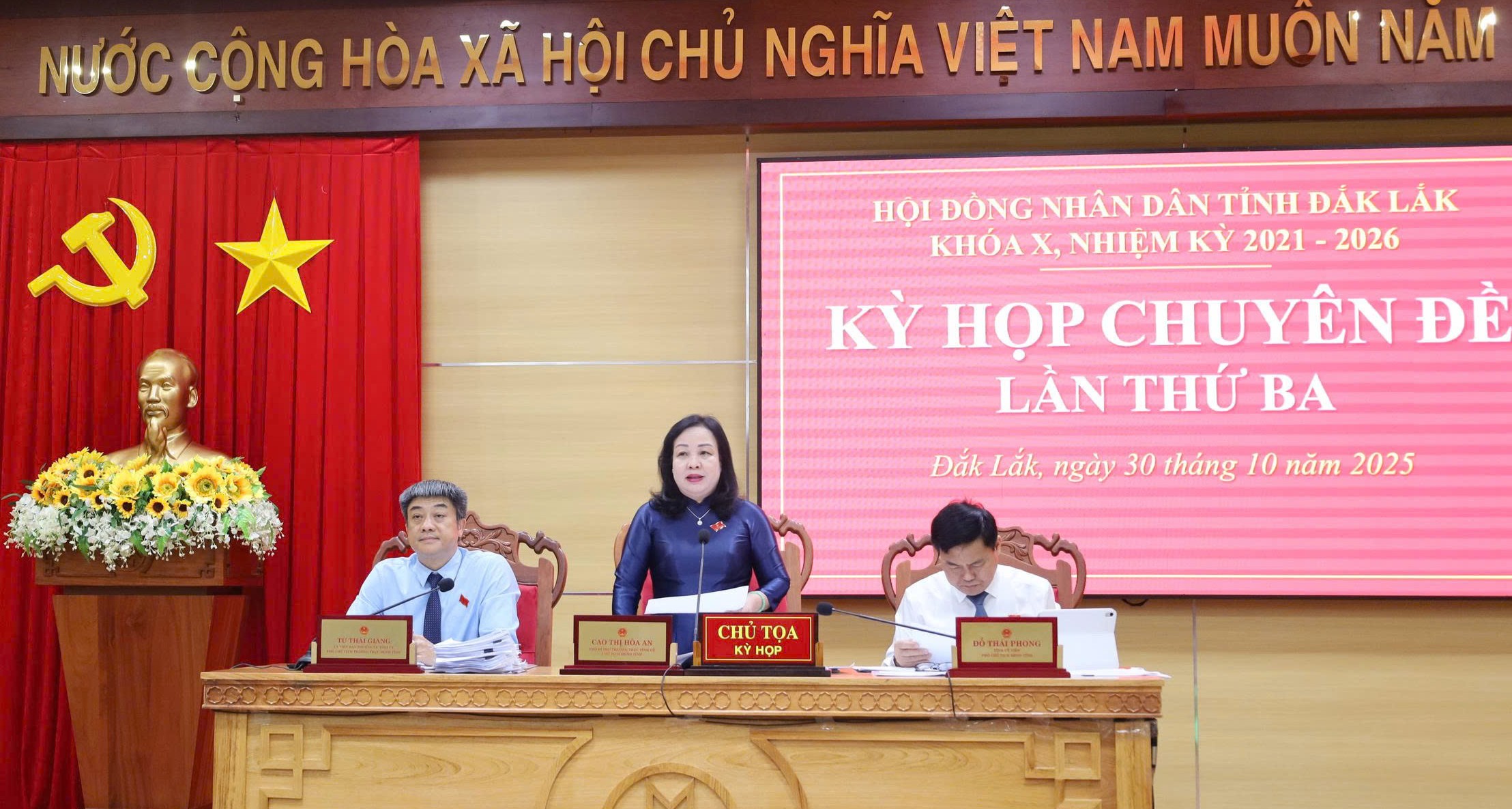 Chiều 30/10, dưới sự chủ trì và điều hành của Phó Bí thư Thường trực Tỉnh ủy, Chủ tịch HĐND tỉnh Cao Thị Hòa An; Ủy viên Ban Thường vụ Tỉnh ủy, Phó Chủ tịch Thường trực HĐND tỉnh Từ Thái Giang; Tỉnh ủy viên, Phó Chủ tịch HĐND tỉnh Đỗ Thái Phong, HĐND tỉnh tổ chức Kỳ họp Chuyên đề lần thứ Ba để thảo luận, quyết định một số nội dung thuộc thẩm quyền.