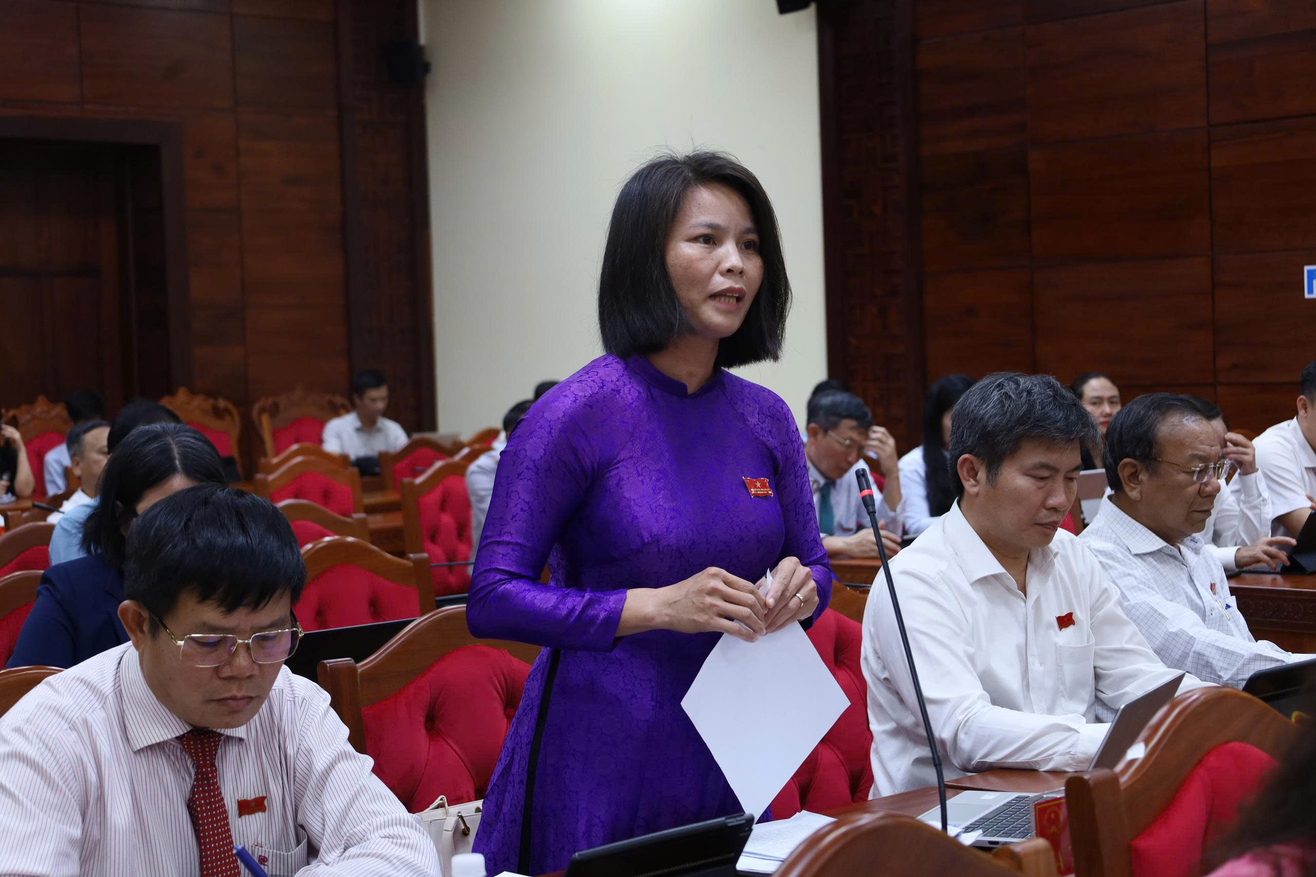 Đại biểu Tạ Thị Thu Hương, Phó Trưởng Ban Văn hóa - Xã hội, HĐND tỉnh phát biểu thảo luận tại kỳ họp.