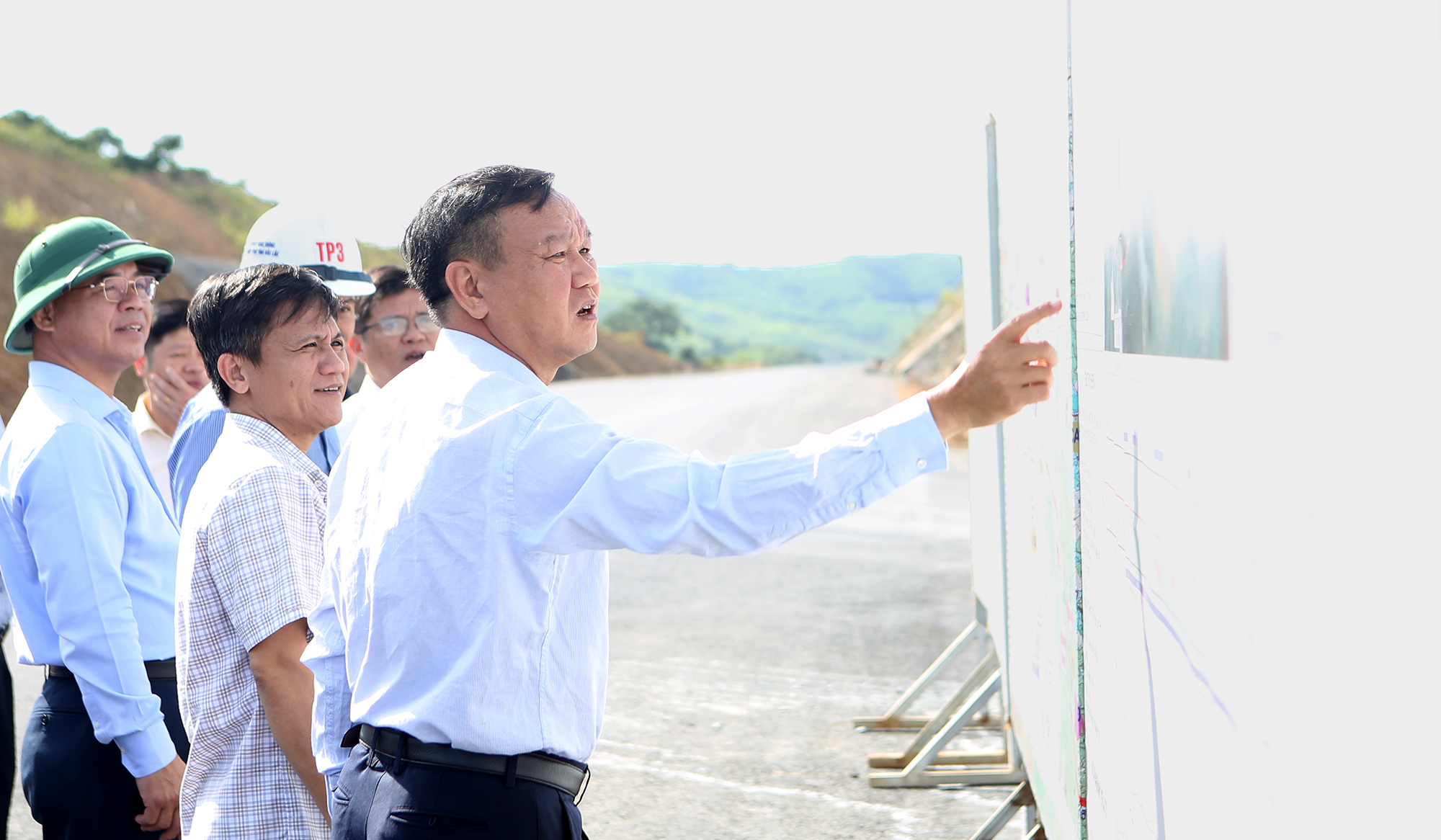 Đoàn công tác theo dõi bảng báo cáo tiến độ thi công Dự án thành phần 3 thuộc Dự án cao tốc Khánh Hòa - Buôn Ma Thuột giai đoạn 1.