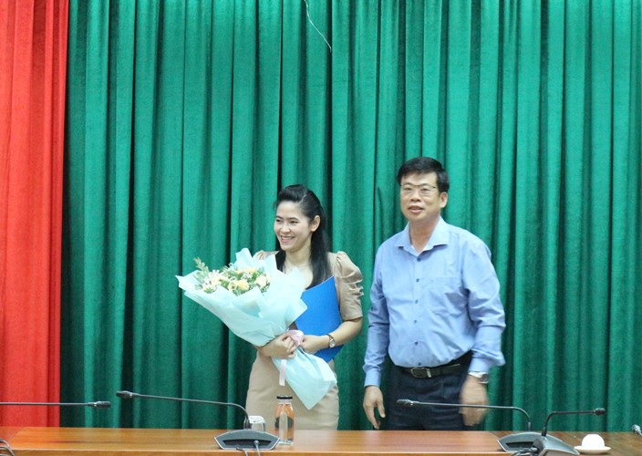 | Chánh Văn phòng UBND tỉnh Bùi Hồng Quý trao quyết định cho bà Cao Như Khánh |