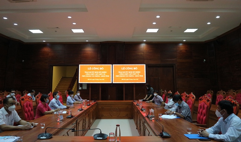 Chiều 07/9, UBND tỉnh tổ chức Lễ Công bố trao quyết định bổ nhiệm công chức giữ chức vụ Phó Chánh Văn phòng UBND tỉnh. Tham dự buổi lễ có đồng chí Phó Chủ tịch Thường trực UBND tỉnh Nguyễn Tuấn Hà; lãnh đạo Văn phòng UBND tỉnh; lãnh đạo Sở Nội vụ; lãnh đạo các phòng, ban, trung tâm thuộc Văn phòng UBND tỉnh.