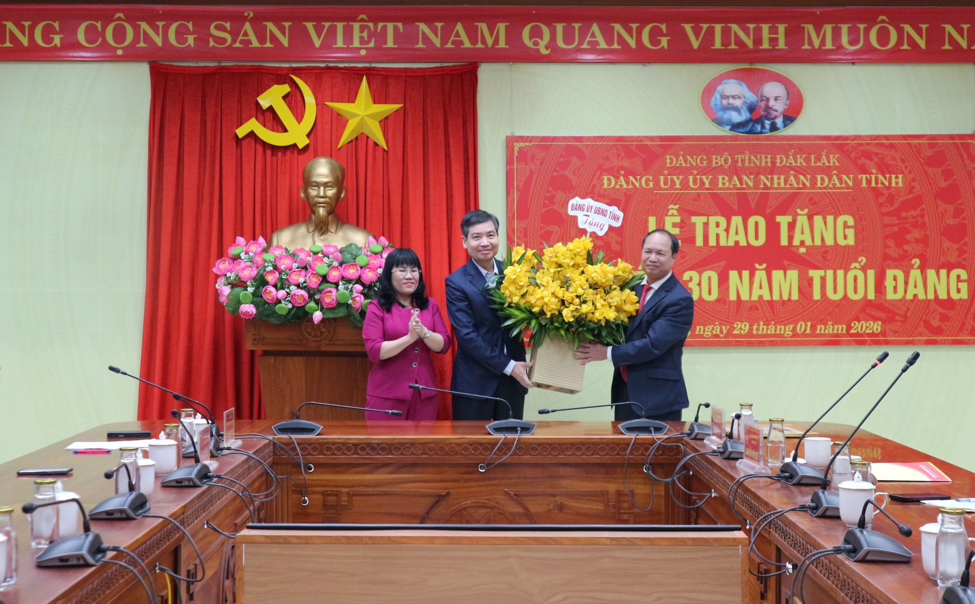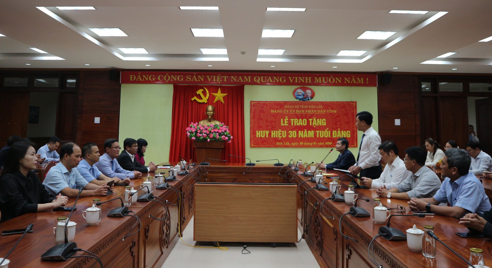 Chiều 29/01/2026, Đảng ủy UBND tỉnh Đắk Lắk đã long trọng tổ chức Lễ trao tặng Huy hiệu 30 năm tuổi Đảng cho đồng chí Tạ Anh Tuấn - Phó Bí thư Tỉnh ủy, Bí thư Đảng ủy UBND tỉnh, Chủ tịch UBND tỉnh. Tham dự buổi lễ có các đồng chí: Hồ Thị Nguyên Thảo - Ủy viên Ban Thường vụ Tỉnh ủy, Phó Bí thư Thường trực Đảng ủy UBND tỉnh, Phó Chủ tịch Thường trực UBND tỉnh; Nguyễn Hữu Việt - Phó Bí thư Đảng ủy UBND tỉnh; Ngô Đình Thiện - Tỉnh ủy viên, Bí thư Đảng ủy, Chánh Văn phòng UBND tỉnh; tập thể Đảng ủy Văn phòng UBND tỉnh; đại diện các đoàn thể thuộc cơ quan Văn phòng UBND tỉnh; Bí thư, Phó Bí thư các Chi bộ và toàn thể đảng viên Chi bộ Tổng hợp thuộc Đảng bộ Văn phòng UBND tỉnh.